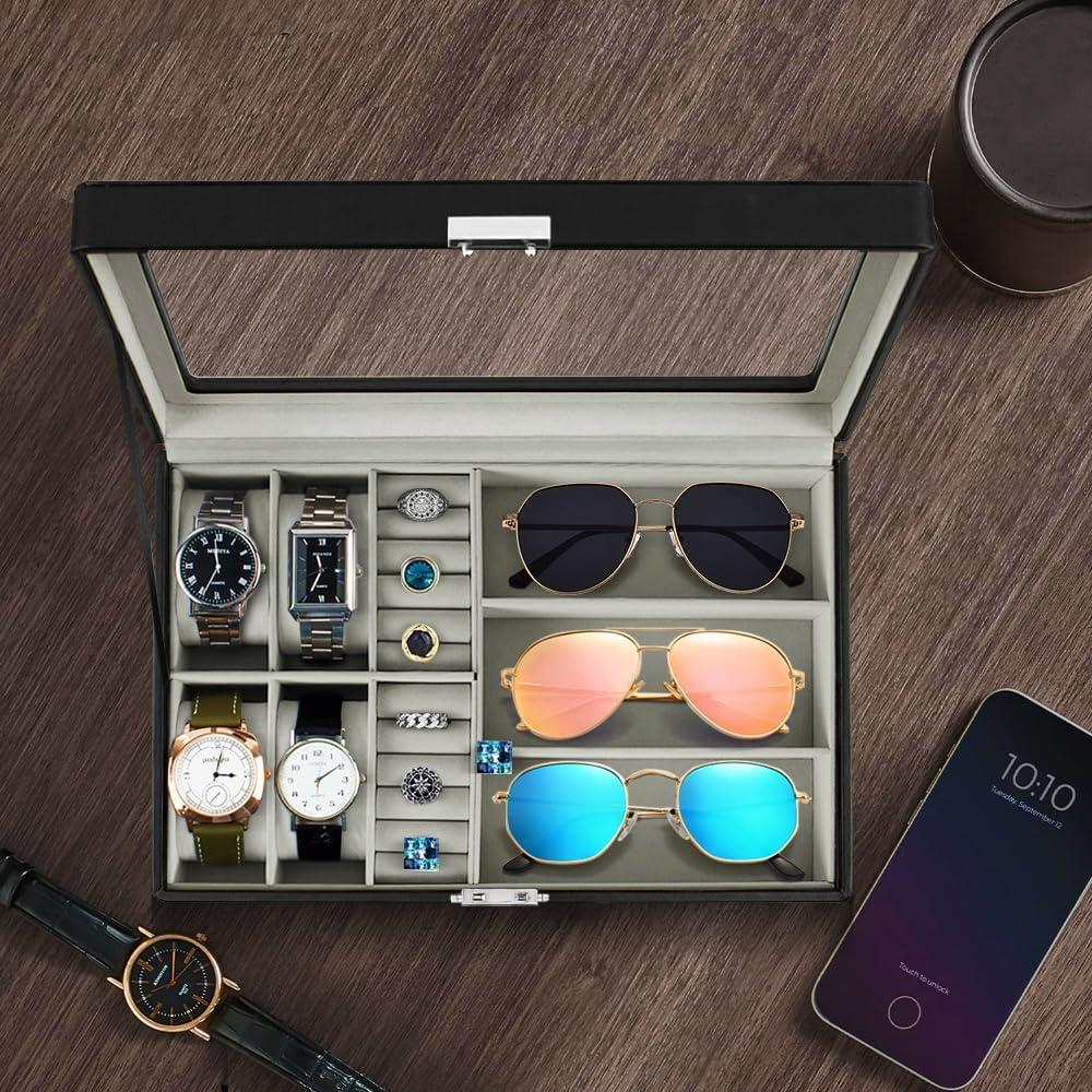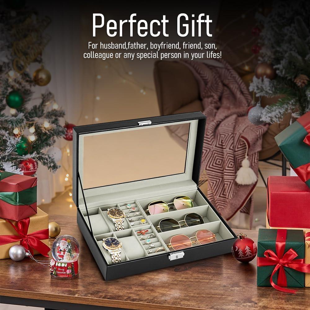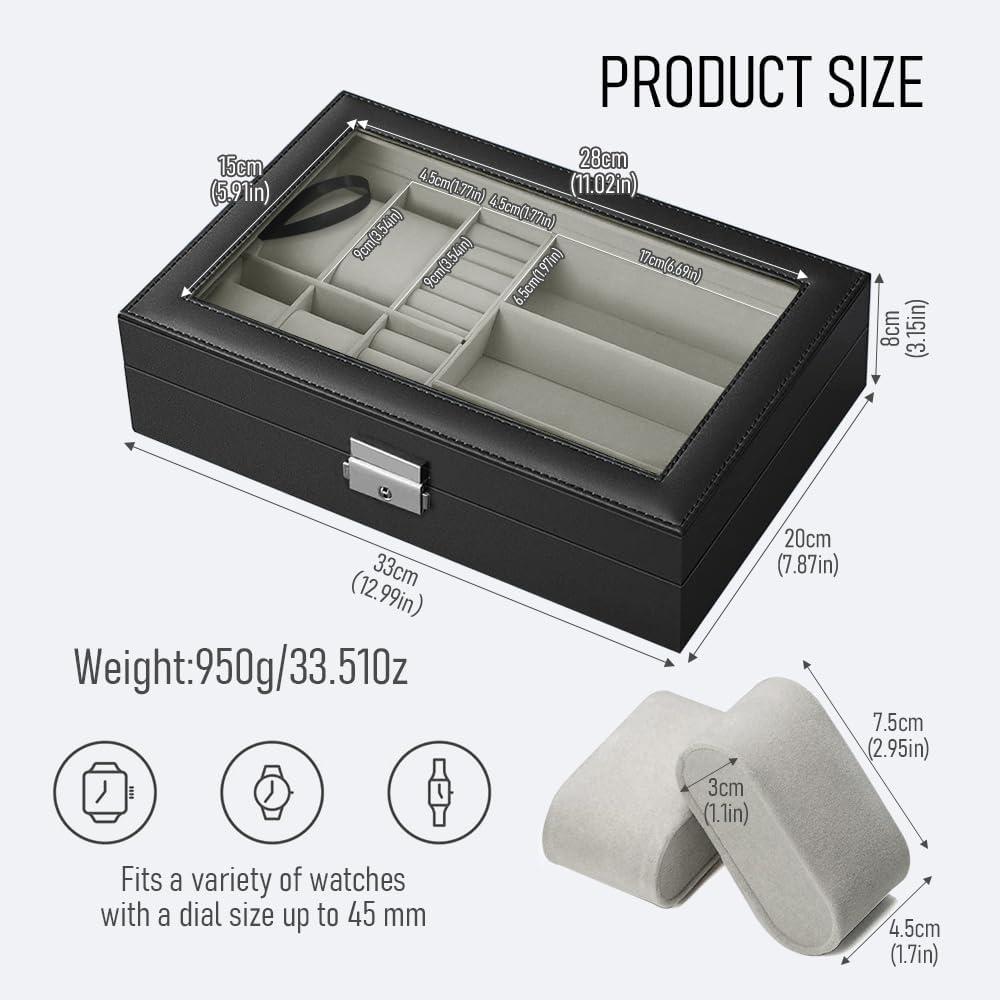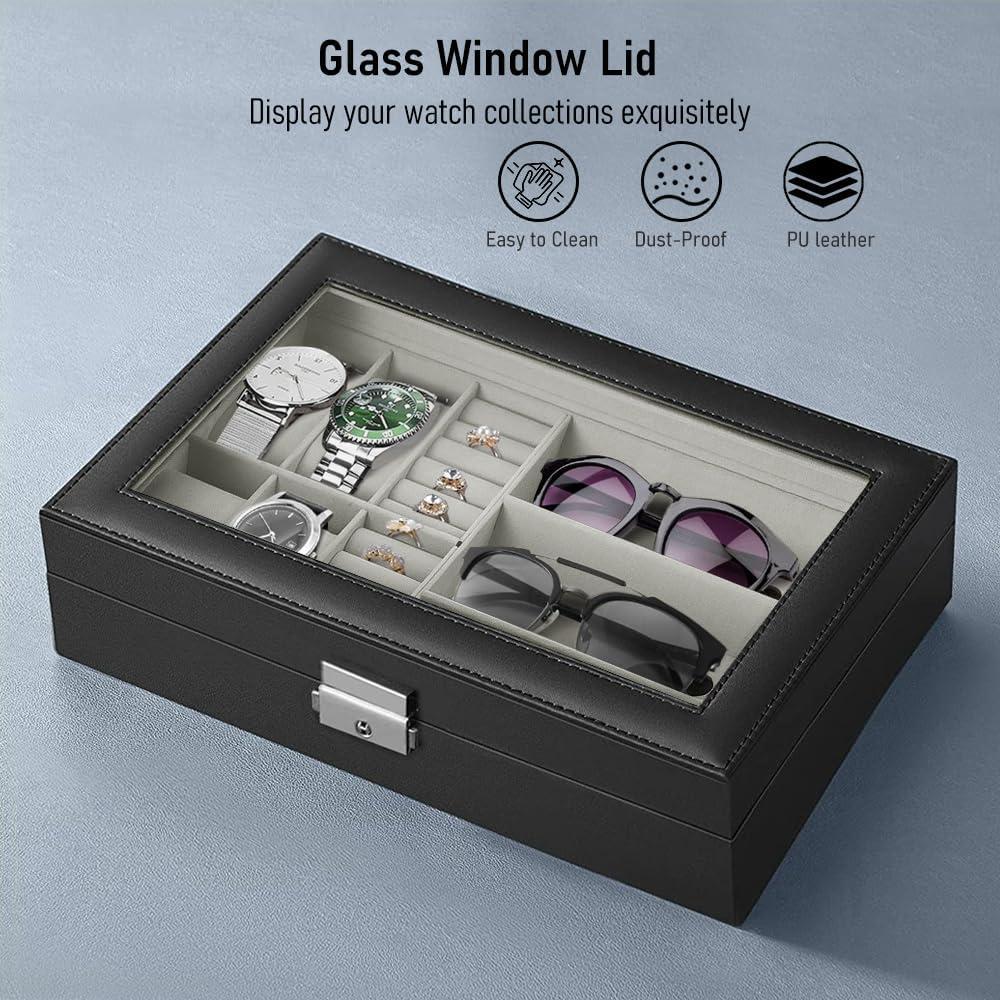 REAL LARGE GLASS LID:The top clear glass of this watch case protects your watch from dust, while offering an open view to display your beloved watch.This watch holder organizer for men provides easy access to help you select which watch to wear.