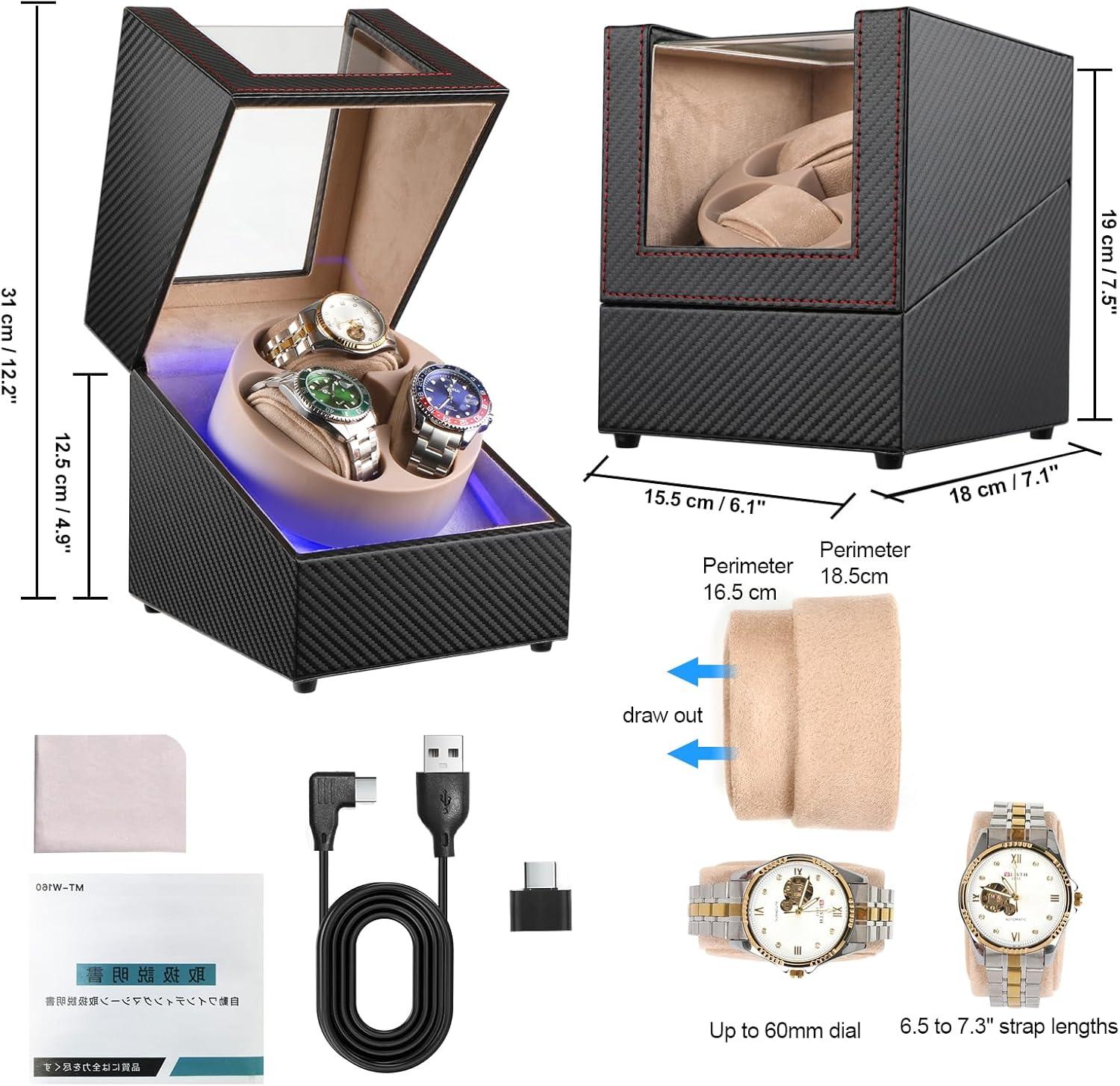 Automatic Watch Winder box with LED and 4 Modes, 3 Watch Winder Super Quiet Mabuchi Motor with USB Type C, Watch Rotator for Man Women