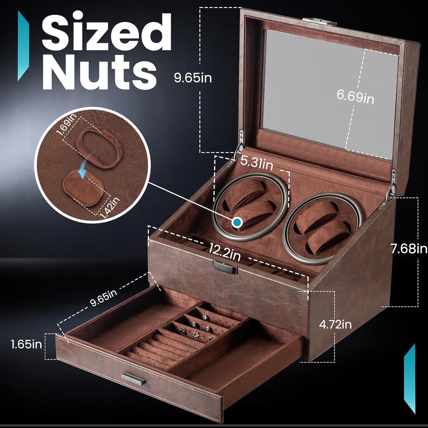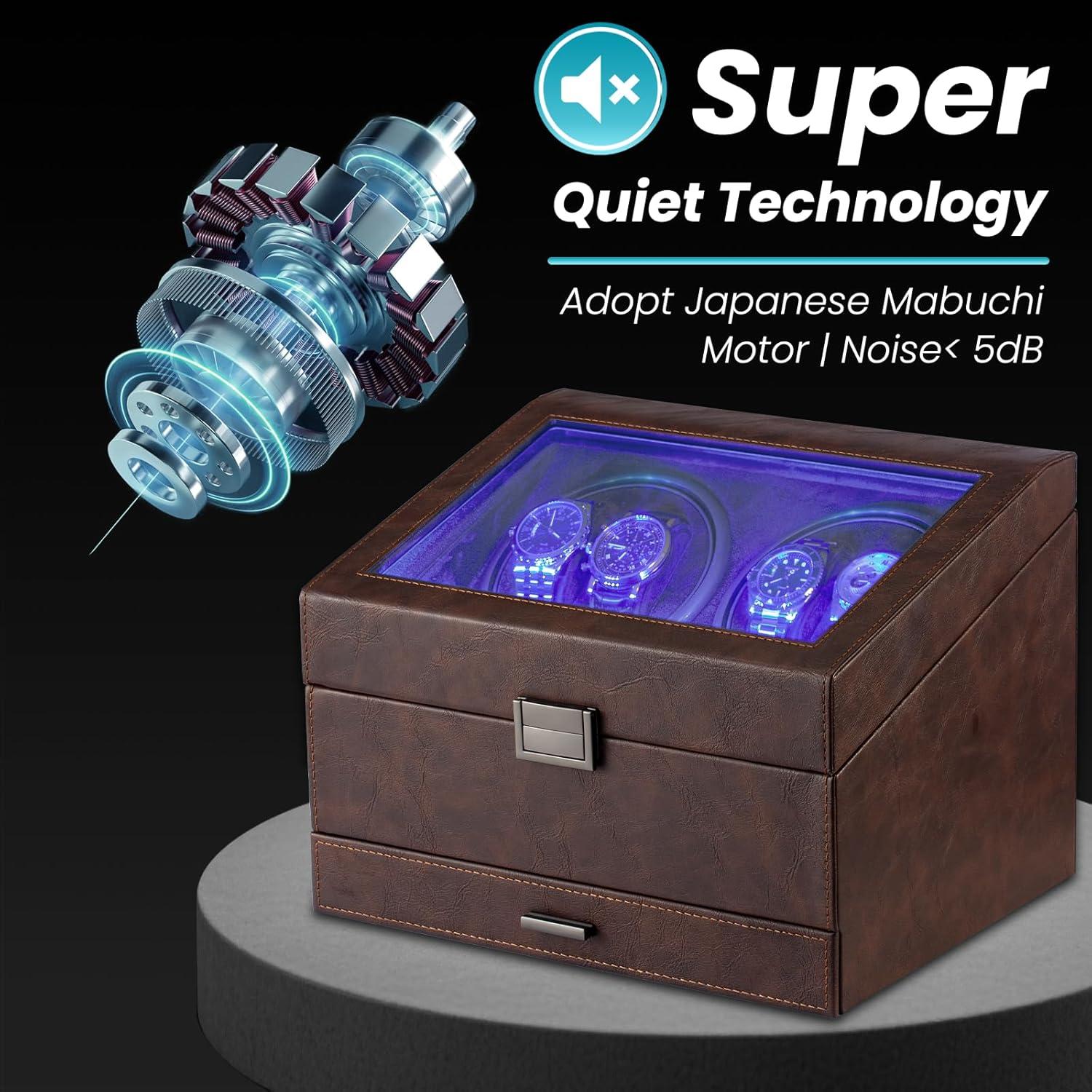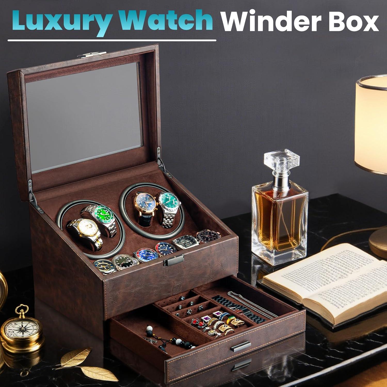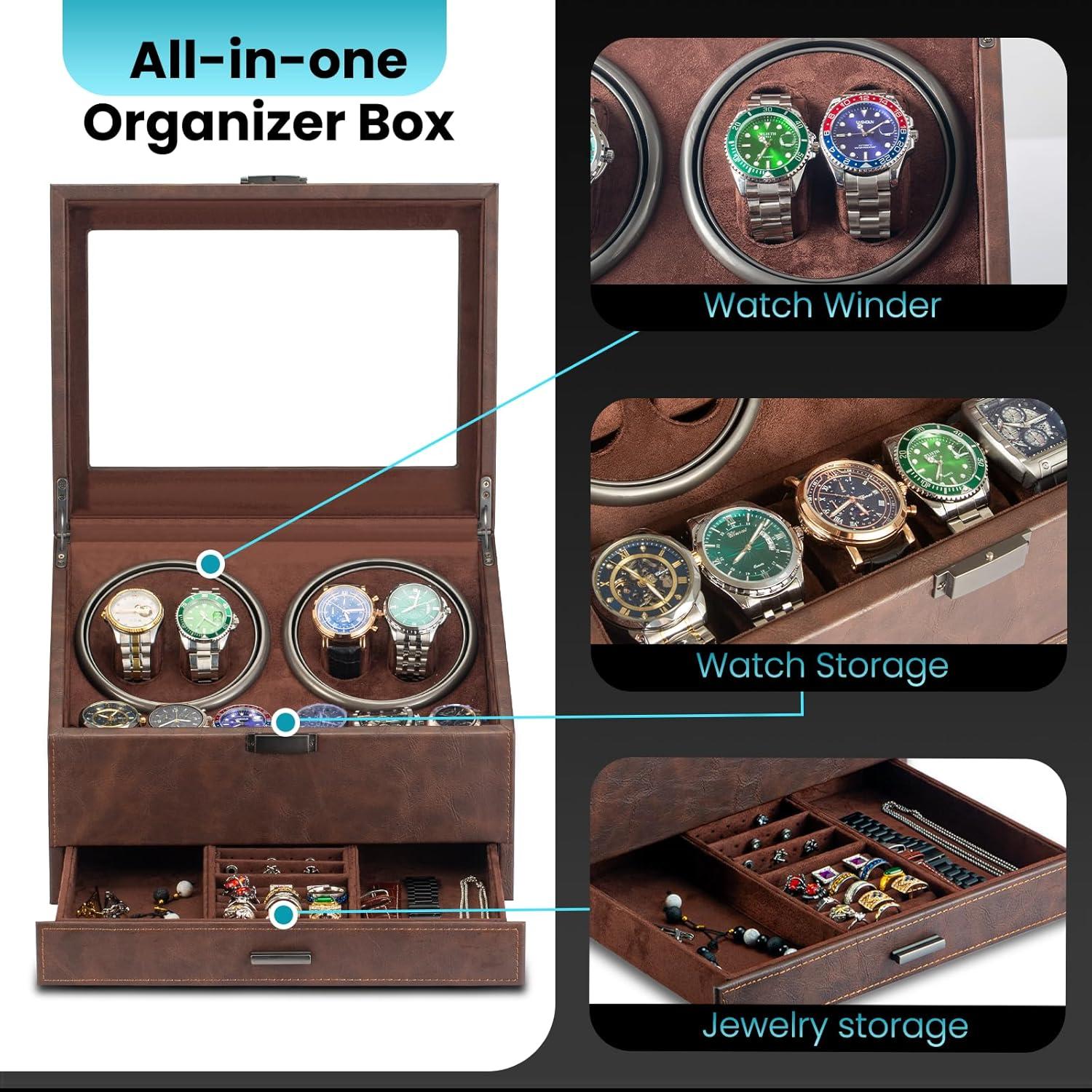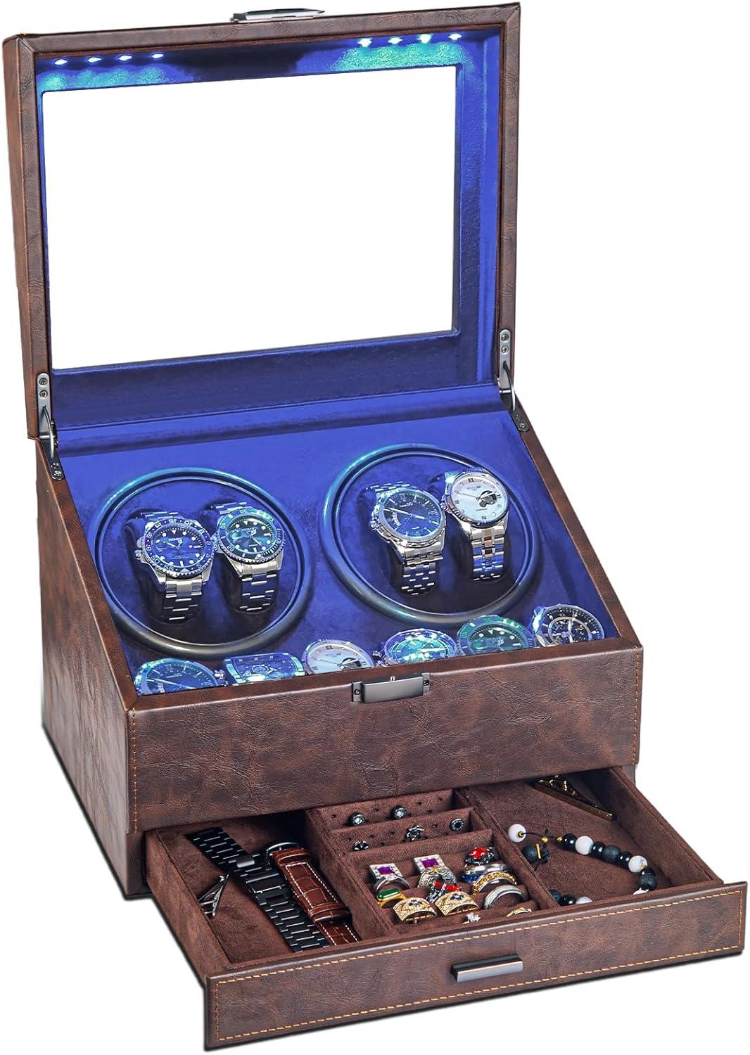 Watch Winders for 4 Automatic Watches,Automatic Watch Winder with Watch Holders and Jewelry Drawer,Quiet Motor (<5dB),Built-in Illumination (Brown)(Brown)