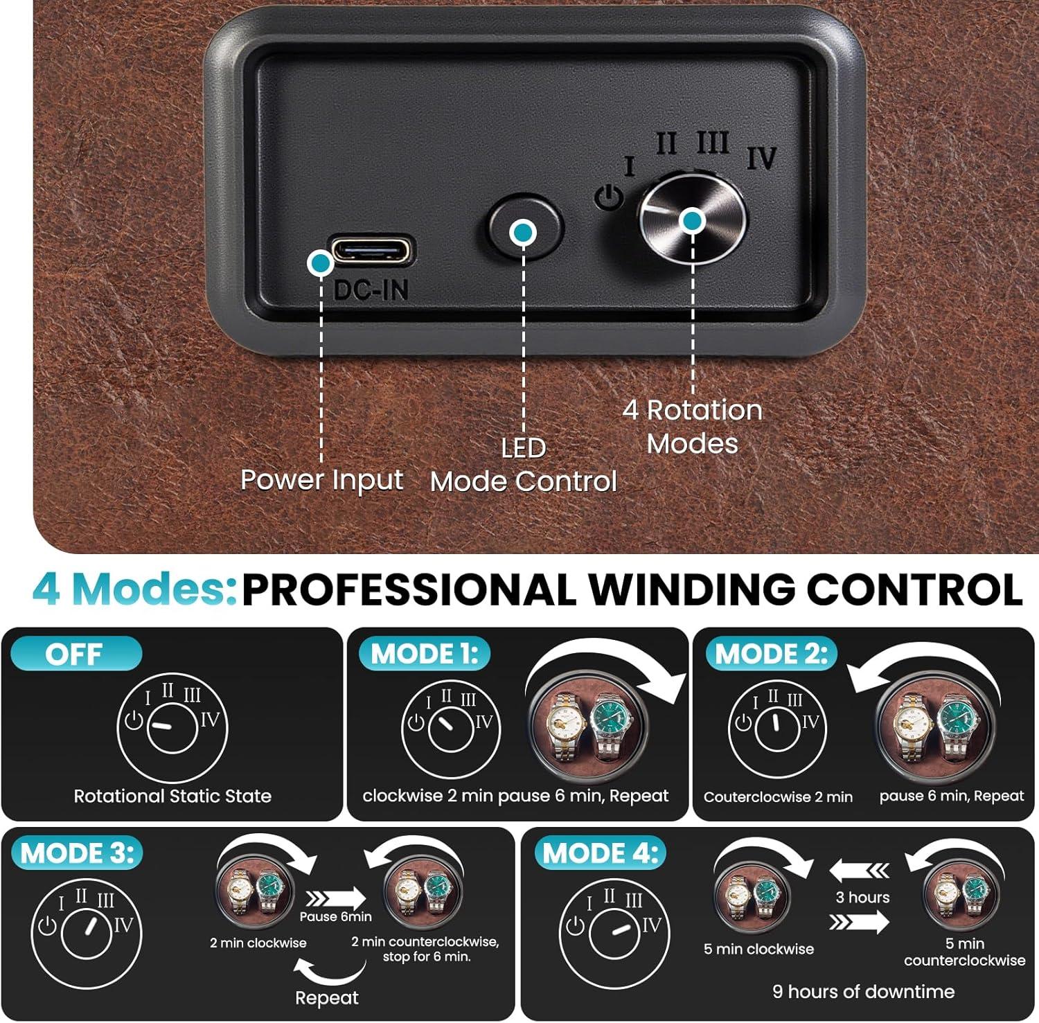 【4 Rotation Setting】The auto watch winder has 4 modes,Mode 1: rotate clockwise for 2 minutes, stop for 6 minutes, recycle; Mode 2: rotate counterclockwise for 2 minutes, stop for 6 minutes, recycle; Mode 3: Rotate clockwise for 2 minutes, stop for 6 minutes; rotate counterclockwise for 2 minutes, stop for 6 minutes, recycle; Mode 4: clockwise for 5 minutes, rotate counterclockwise for 5 minutes, work for 3 hours and stop 9 hours.